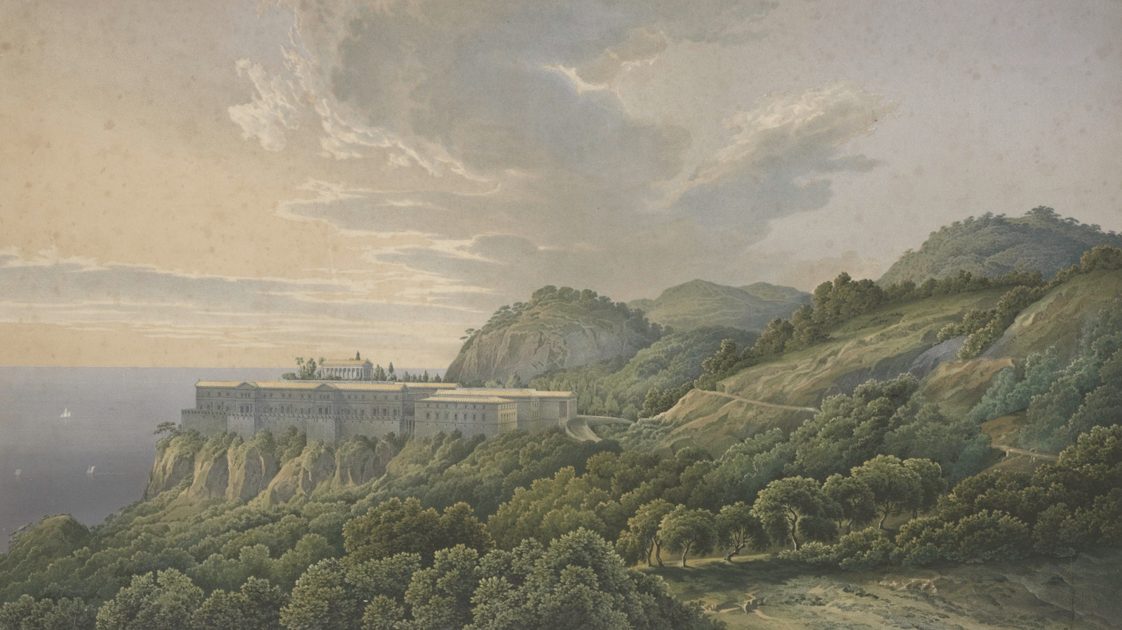 После афинской неудачи «величайшим императорским домом на земле», по словам Шинкеля, должен был стать дворец в Ореанде. Когда проект на сорока листах был доставлен в Санкт-Петербург, то поразил заказчиков своим размахом. На скале в Ореанде Шинкель предлагал возвести сооружение колоссальных масштабов. Дворец предполагалось выстроить вокруг огромного Императорского атриума, и состоять он должен был из многочисленных анфилад залов, окружавших атриум с четырех сторон. Главный вход с северной стороны предваряли три служебных корпуса, выполнявших роль пропилеев, каждый со своим атриумом и бассейном. Центральный из этих корпусов в проекте был соединен вестибюлем с главным входом во дворец, украшенным шестиколонным дорическим портиком с колесницей Аполлона на фронтоне. Пройдя под ним, вы оказывались бы в Императорском атриуме — саду с фонтанами, бассейнами, перголами, увитыми виноградной лозой, аллеями и дорожками. В центре этого сада находился колоссальный постамент, внутри которого располагался грот с сужающимися к верху тесаными сводами, решенными в стиле Митридатовой гробницы в Керчи — здесь Шинкель предложил расположить Музей Крыма и Кавказа, сокровищницу свезенных со всего северного Причерноморья античных древностей. Лестницы западной и восточной сторон этого постамента вели на видовую террасу на крыше Музея, в центре которой был поставлен павильон в виде эллинистического храма-бельведера с двумя рядами колонн. По замыслу архитектора, он должен был господствовать над всем дворцом и окружающей местностью.