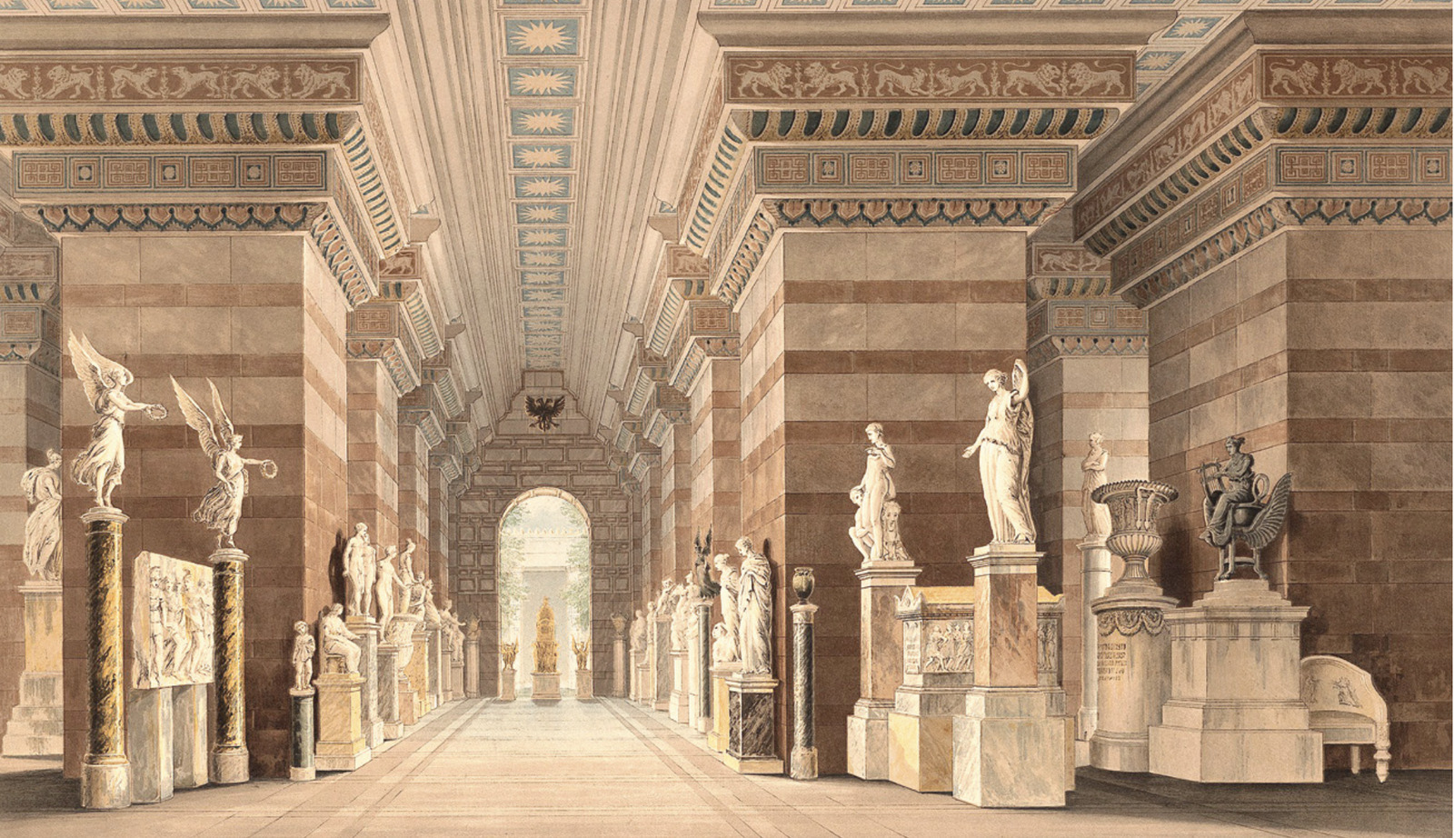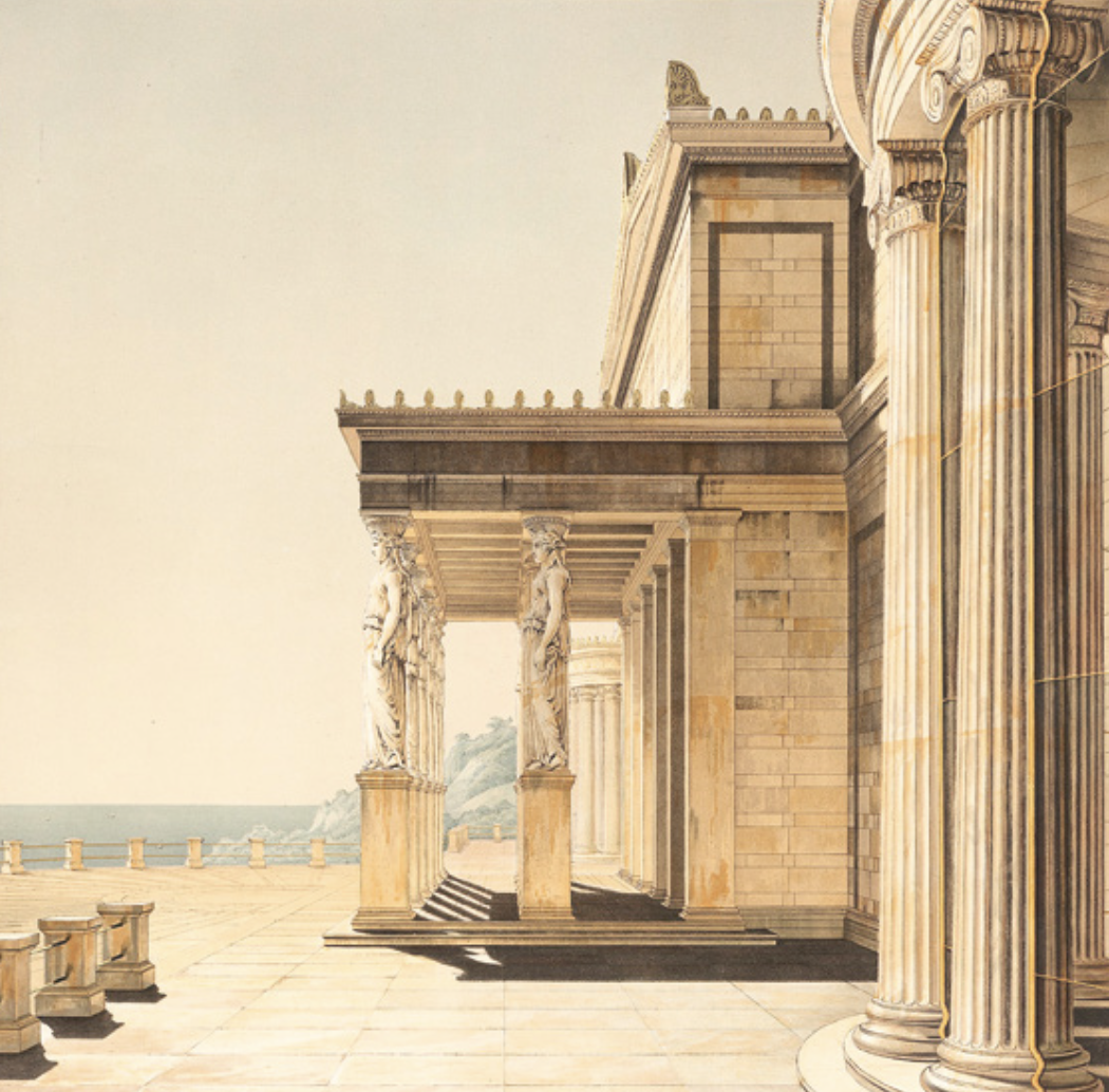 Карл Фридрих Шинкель (1781–1841) был одним из самых ярких зодчих того времени в Европе. Старшая дочь прусского короля Фридриха Вильгельма III и королевы Луизы, выданная в 1817 году за великого князя Николая Павловича и ставшая из Шарлотты Александрой Федоровной, с Шинкелем была знакома лично. Именно по его проекту, который он подарил Александре Федоровне в Потсдаме в 1829 году, к 1833 году была построена готическая капелла Александра Невского близ Петергофа. И именно Шинкель возвел в Потстдаме для ее брата, наследного принца Фридриха-Вильгельма IV Прусского, виллу Шарлоттенхоф (1833–1835) в неоримском стиле, которая ей очень понравилась.